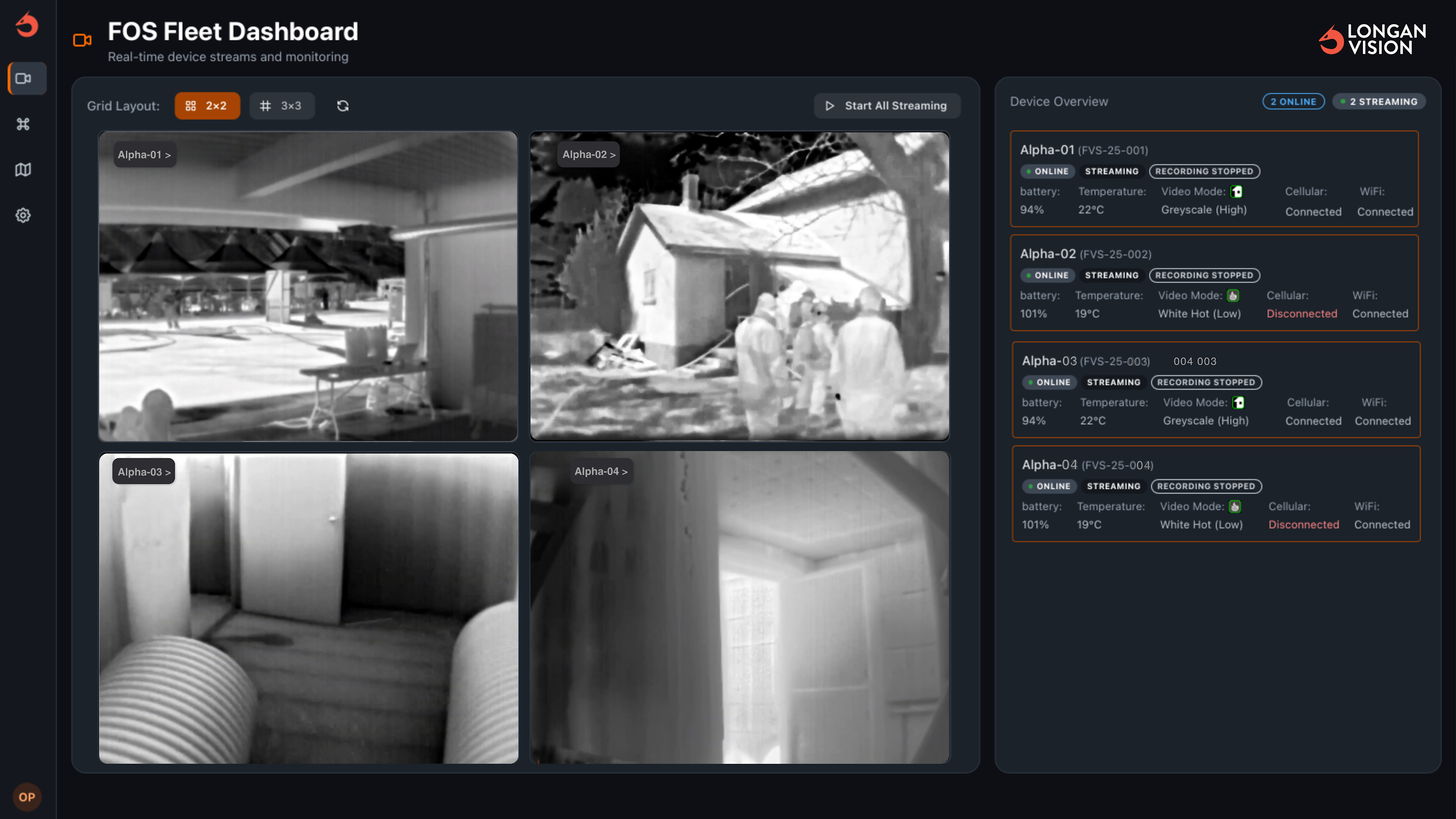 The Fusion Vision System is designed not only as a wearable device, but as a connected system that can extend situational awareness beyond the individual firefighter.Integrated wireless connectivity allows the system to function as a data hub, enabling thermal video and sensor information captured in the field to be shared with command and support teams when appropriate.Using built-in Wi-Fi and Bluetooth, the Fusion Vision System can stream real-time thermal video and data from connected Bluetooth sensors to a Longan Vision command post - F.O.S Feet or 3rd party monitoring system via Longan Vision Cloud Service - F.O.S™ CS